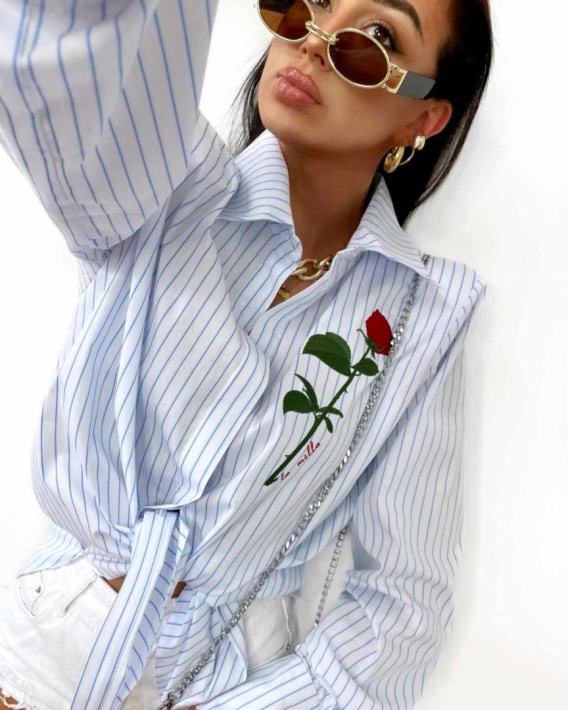 Biała koszula w błękitne paski z różą La Milla