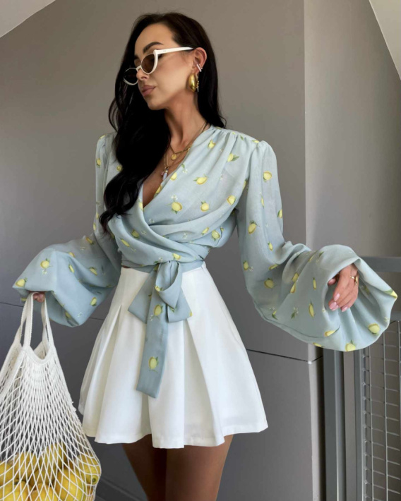 Bluzka o kopertowym dekoldzie z regulowaniem w talii. Szyfonowy, przewiewny materiał. Modny print w cytrynki.