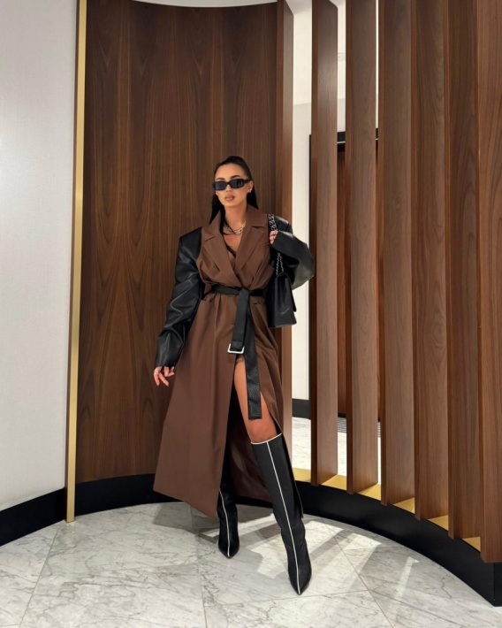 Czekoladowy trencz ze skórzanymi rękawami La Milla