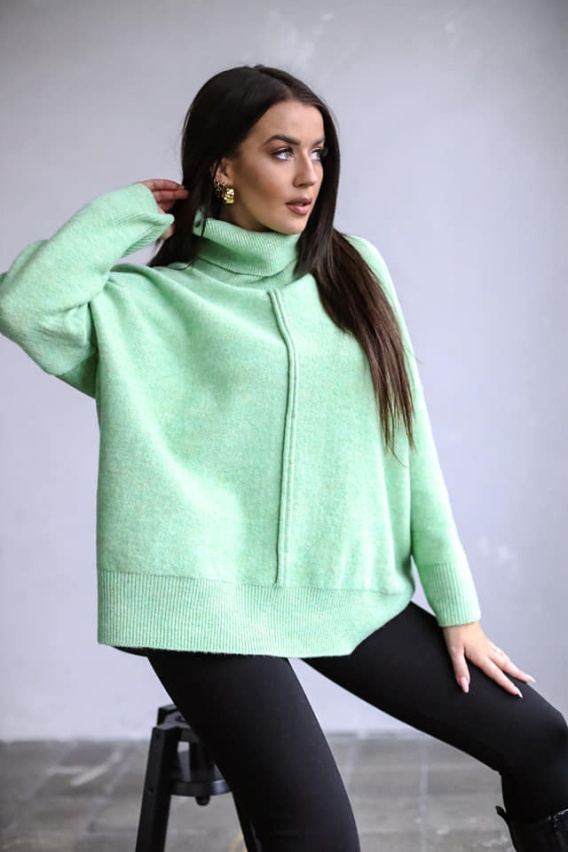 Sweter z golfem wykonany z przędzy o równomiernym, gładkim splocie. Ozdobiony podłużnym szwem z przodu z tyłu swetra. Luźniejszy krój oversize. Cudowne dopełnienie jesienno-zimowej stylizacji: dżinsów, legginsów, spódnicy.