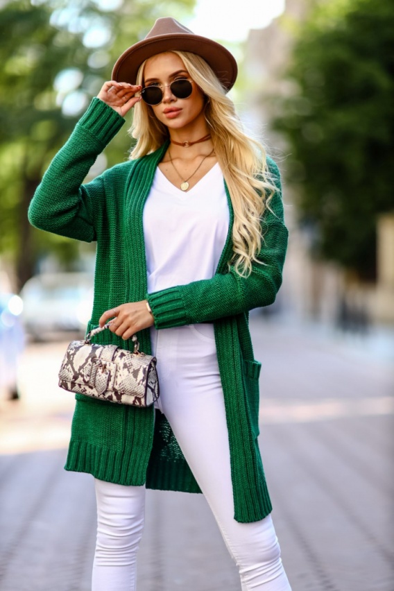 Jesienny kardigan o ciekawym, grubym splocie. Z przodu naszyte pojemne kieszenie. Z tyłu splot warkoczykowy.