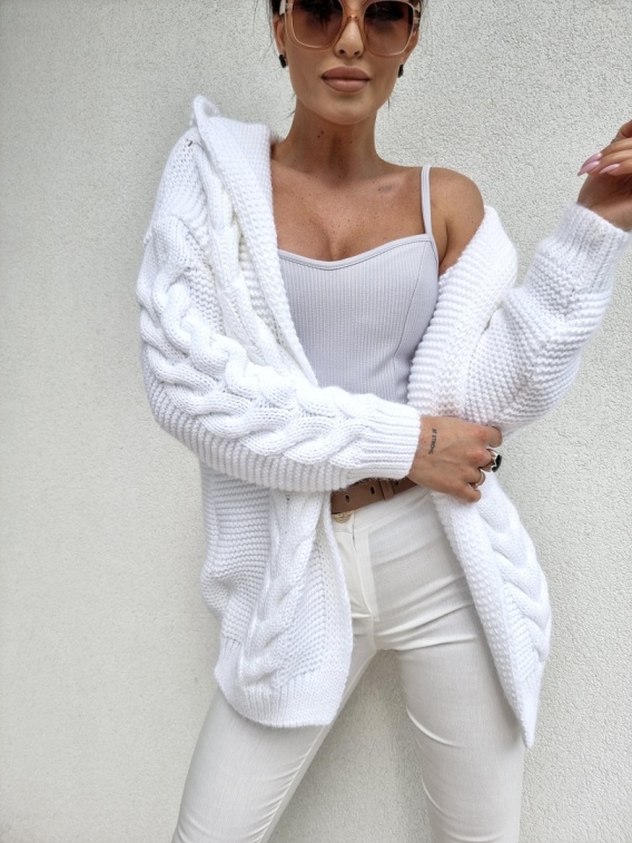Cudownie wygodny i uniwersalny kardigan, który będzie pięknym uzupełnieniem każdej stylizacji. Piękny warkoczowy wzór, duży kaptur, miękki materiał to niewątpliwe atuty tego modelu.