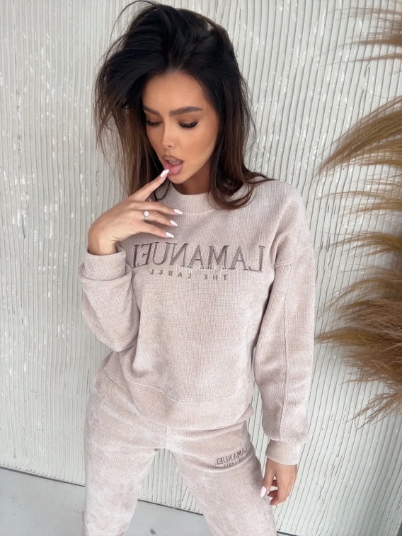 Komplet damski dresowy z miękkiego a’la sztruksu wykonany z bardzo miłego w dotyku materiału. W jego skład wchodzi bluza bez kaptura z haftowanym logo marki oraz spodnie. Spodnie dresowe z podwyższonym stanem posiadają gumkę w pasie, dwie kieszenie oraz dół nogawek zakończony ściągaczami. Dres jest bardzo wygodny, elastyczny i komfortowy.