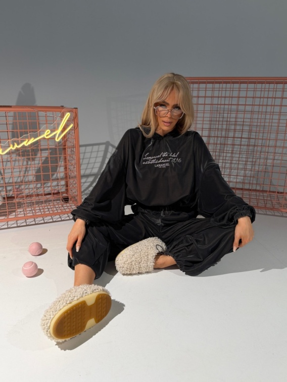 Aksamitna dzianina z delikatnym refleksem – gładka, przyjemna w dotyku, ale bez zbędnego połysku. Wysoki stan, szeroka guma w pasie i dodatkowa regulacja sznurkiem. Nogawki proste, lekko lejące, z możliwością ściągnięcia na dole dzięki ukrytej gumce. Na biodrze haft – detal, który robi różnicę. Subtelny, ale wyczuwalny. Te spodnie wyglądają stylowo nawet w połączeniu z basicowym topem. Efekt jak z setu, nawet gdy nosisz je solo.