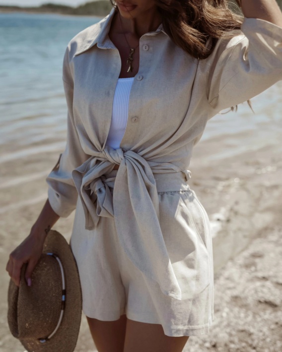 Lniany komplet składający się z koszuli o kroju oversize oraz szortów, Koszula ma luźny krój i jest zapinana na guziczki. Szorty z gumką w pasie i wiązaniem. Kieszonki po bokach.