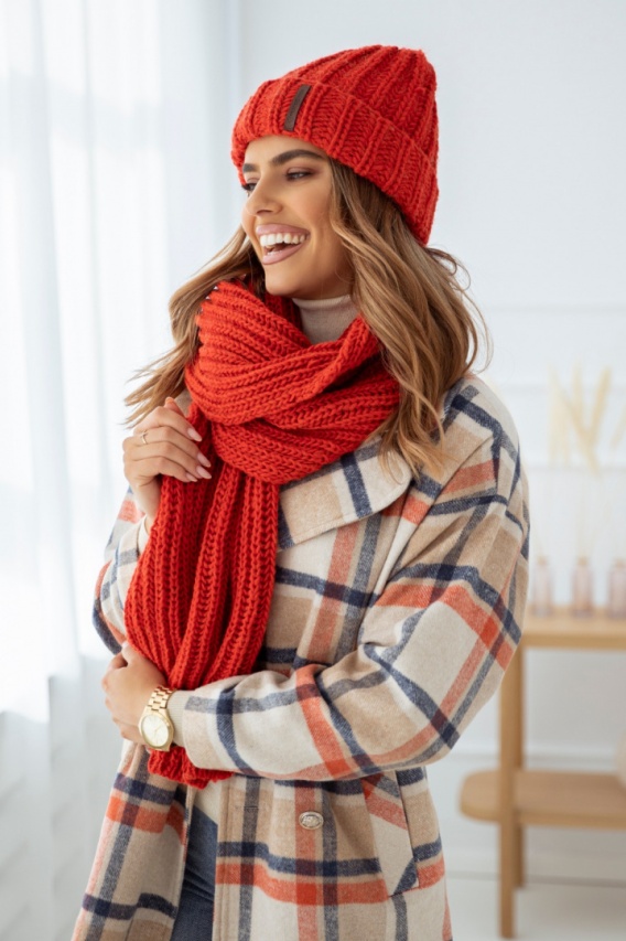 Komplet szal i czapka BEANIE HANDMADE ceglasty czerwony - SEMPRE