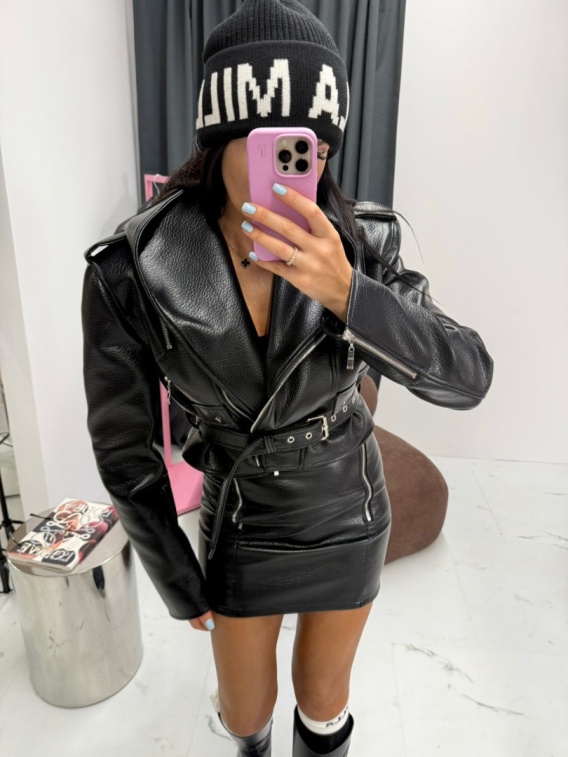 Efektowna ramoneska z kapturem z wysokiej jakości ekoskóry.