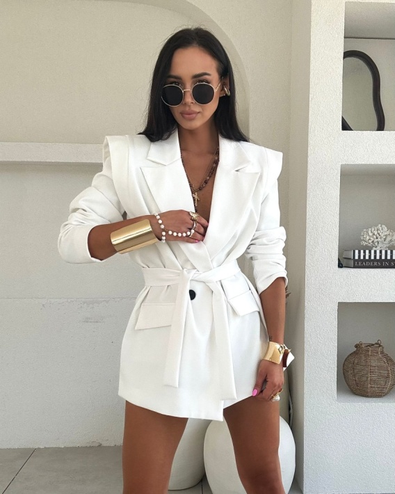 Biała marynarka La Milla, model "Wigilia"- o prostym i oversizowym kroju z poduszkami w ramionach. Na podszewce, zapinana na guziki. Klapki od kieszonek na przodzie u dołu marynarki. Materiałowy paseczek w komplecie.