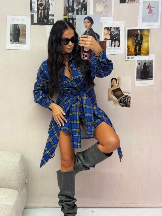 Bawełniana sukienka koszulowa w kratkę o niepowtarzalnym kroju. WIązanie w pasie i dłuższe elemenenty po bokach sukienki.