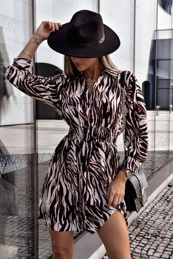 Kobieca sukienka z miękkiej wiskozy w zwierzęcy wzór. Kołnierzyk dekolt w literę V. W talii gumka.
