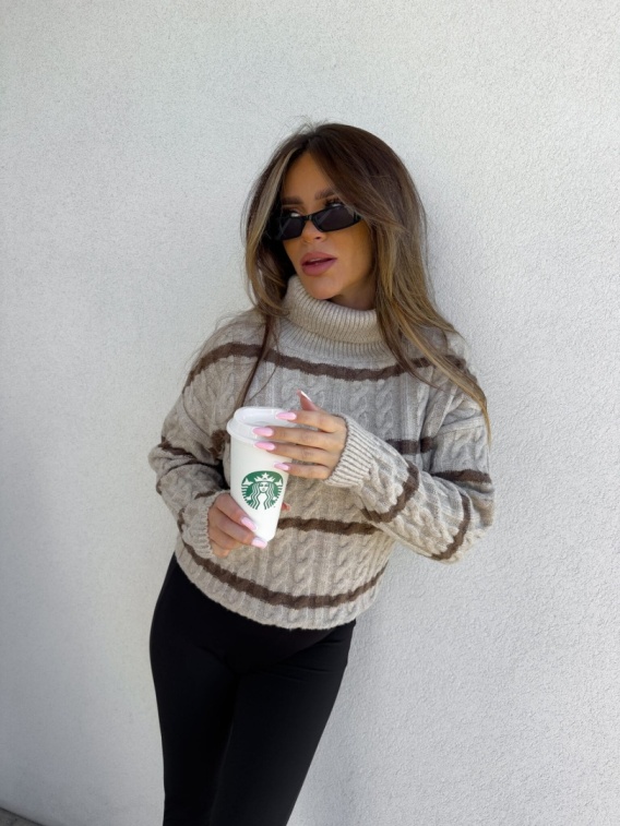 Sweter golf INKO pasy beżowo czekoladowe By Me