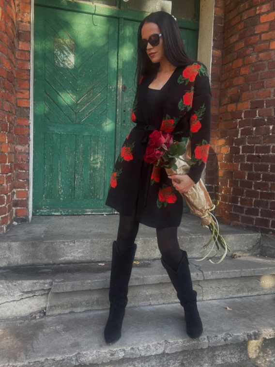 Żakardowy kardigan z domieszką wełny w róże czarny - LA MILLA