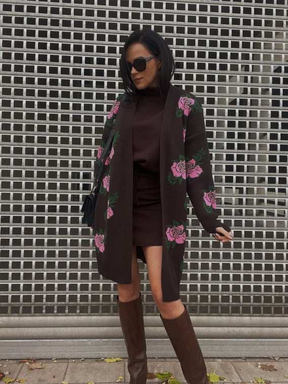 Żakardowy kardigan z domieszką wełny w róże czekoladowy - LA MILLA