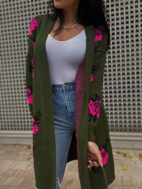 Żakardowy kardigan z domieszką wełny w róże khaki - LA MILLA